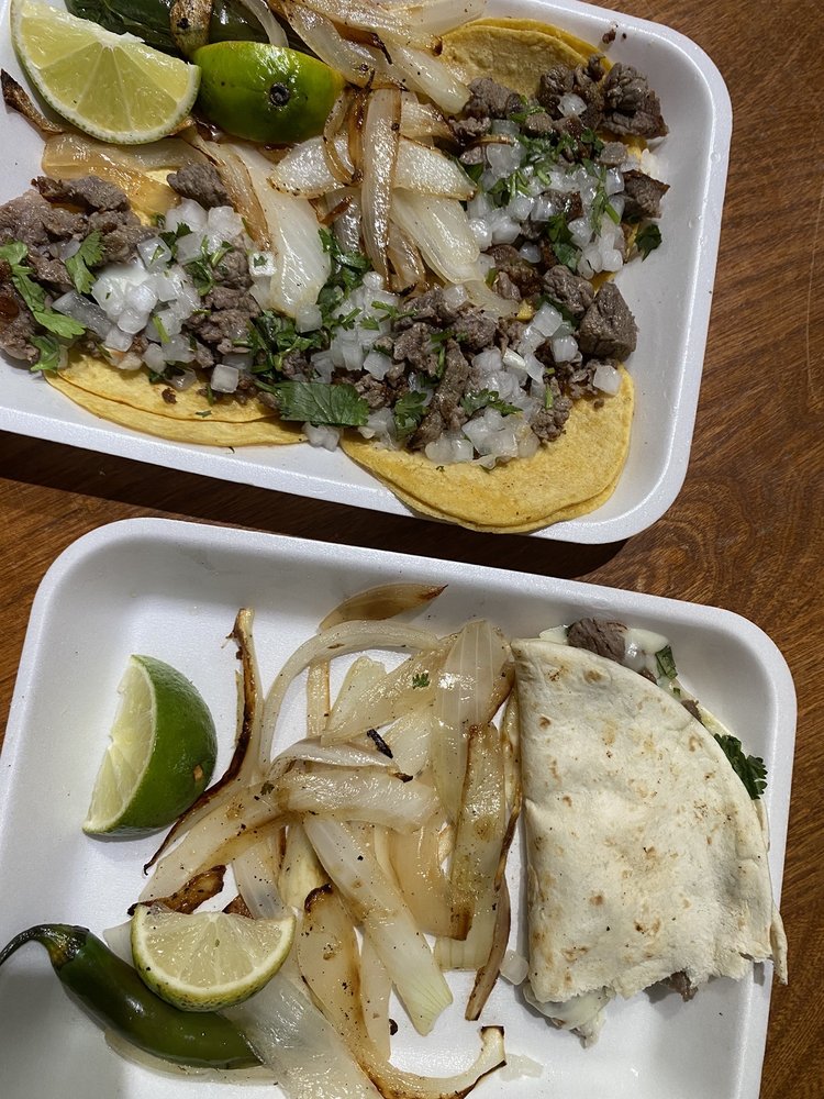 Asada, chorizo, queso Oaxaca, pimiento morrón, cebolla y tortillas. / Asada, sausage, Oaxaca cheese, bell pepper, onion and tortillas.